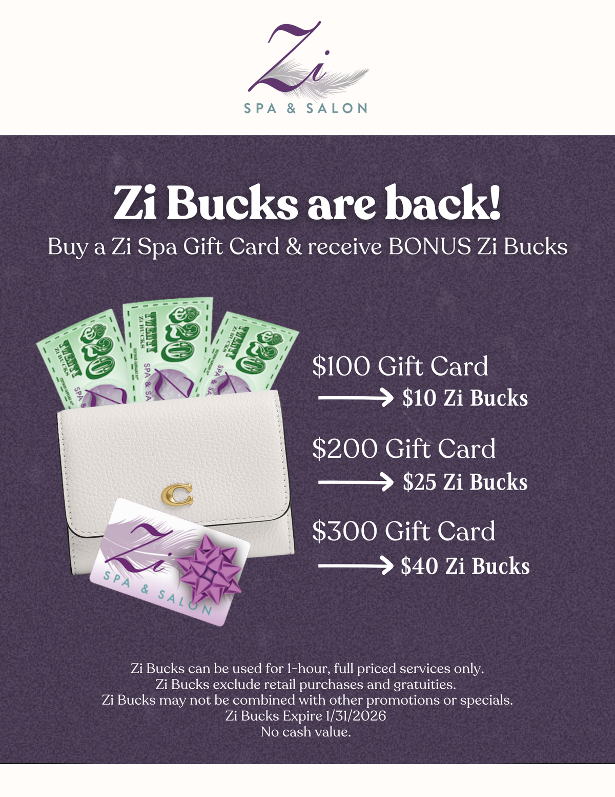 Zi Bucks can be used for 1-hour, full priced services only. Zi Bucks exclude retail purchases and gratuities. Zi Bucks may not be combined with other promotions or specials. Zi Bucks Expire 1/31/2026 No cash value.